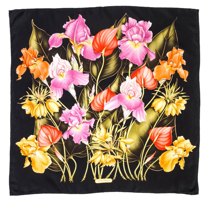 fritillaria imperialis, irises, and laceleaf pattern. Labeled within the print: Salvatore Ferragamo