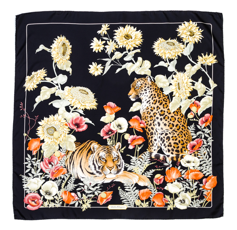 leopard, tiger, sunflower, and poppy pattern. Labeled within the print: Salvatore Ferragamo