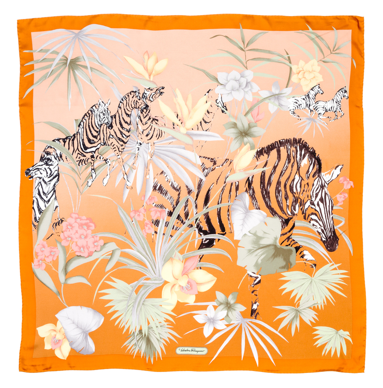 zebra, bird-of-paradise floral, and leaf pattern. Labeled within the print: Salvatore Ferragamo