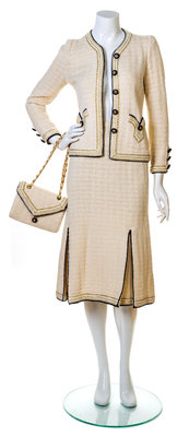 An Adolfo Cream, Gold and Navy Knit Skirt Ensemble,