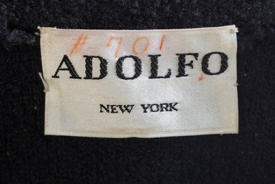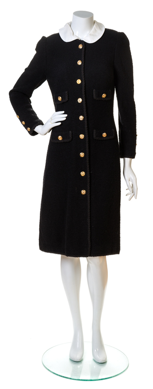 with long sleeves, decorative goldtone buttons at the front closure, four faux front flap pockets and a white detachable collar.Labeled: Adolfo.