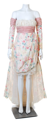 comprised of a lace dress with a floral silk overlay, a ruched lace and striped bodice with a front open side split gathered at the waist, a back striped matching ribbon detail, side zip closure with a scalloped hem; together with a detachable matching layered floral silk and swiss dot cape with ruffle trim and matching silk arm sleeves.Labeled: Bernard Perris.