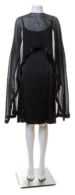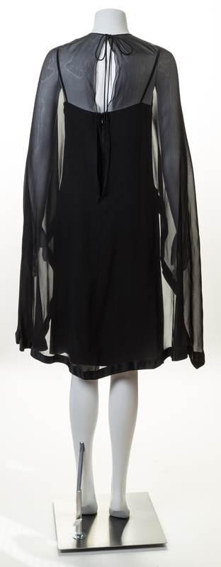 with spaghetti straps, a fitted silhouette, a back zip closure, an attached sheer high-low capelet with silk trim and a tie closure at the back neck.Labeled: Bill Blass.