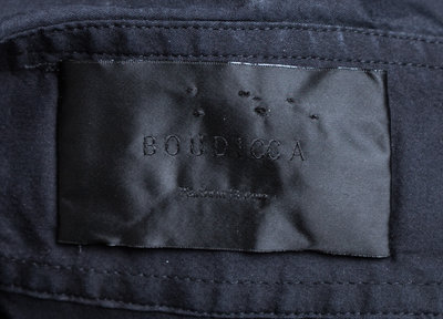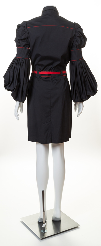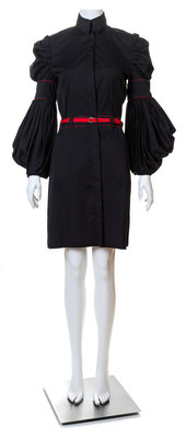 with red trim, a pointed collar, balloon sleeves gathered at the shoulder with cigar band detail, full button front closure and a red belt at the fitted waist.Labeled: Boudicca.