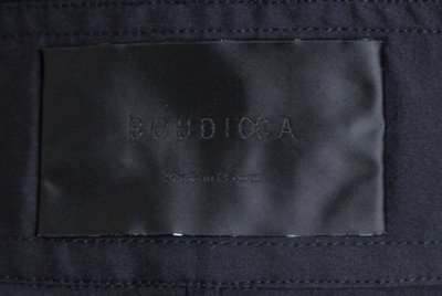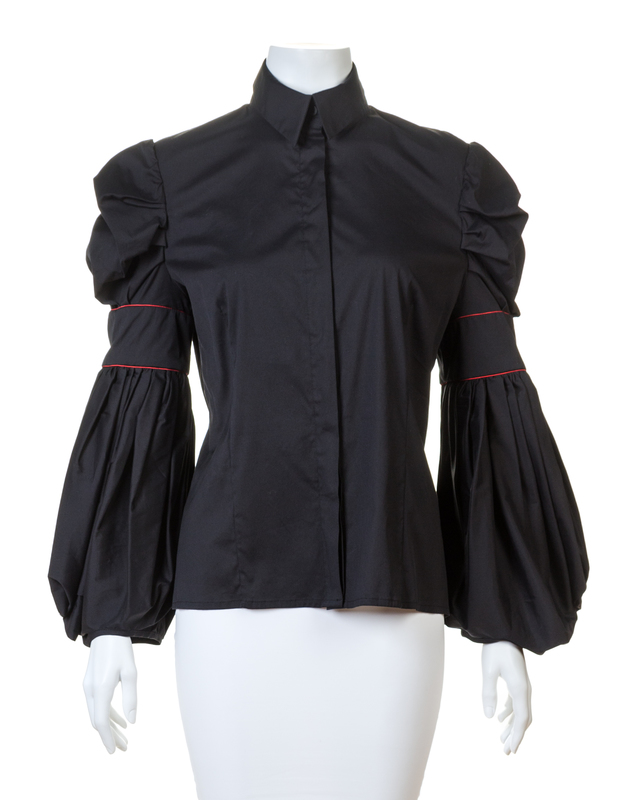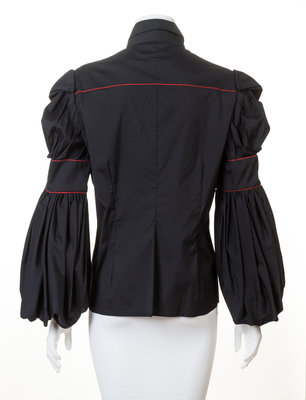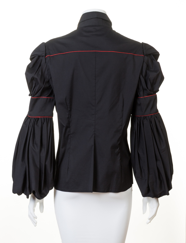 with red trim, a pointed collar, balloon sleeves gathered at the shoulder with cigar band detail and full button front closure.Labeled: Boudicca.