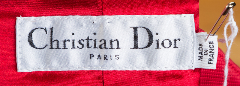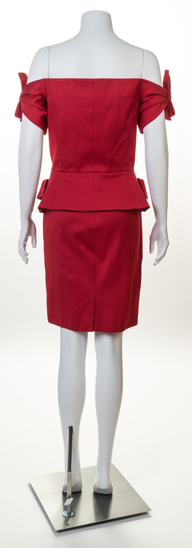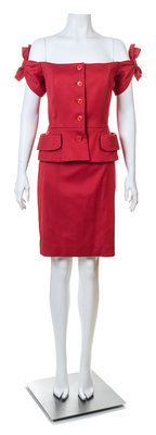comprised of an off the shoulder jacket with bow accented cap sleeves, front button closure and decorative flap pockets; together with a straight knee length skirt with a back split hem.Each labeled: Christian Dior.