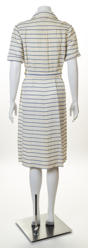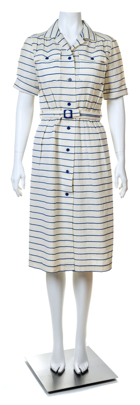 with short sleeves, a notched collar, front button closure, front chest flap pockets, and two slip pockets with a removable matching belt.Labeled: Courreges.
