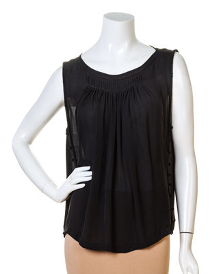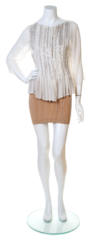 comprised of a black silk sleeveless Dries van Noten blouse with pleat detail and decorative beading; together with an Okira cream sheer jacket with silvertone sequin embellishment, silver embroidery and front snap closure.Labeled: Dries Van Noten and Okira.