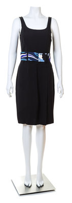 with a scoop neckline, a fitted waist, a front side split hem, a side zip closure and a removable wide print belt.Dress labeled: Emilio Pucci.