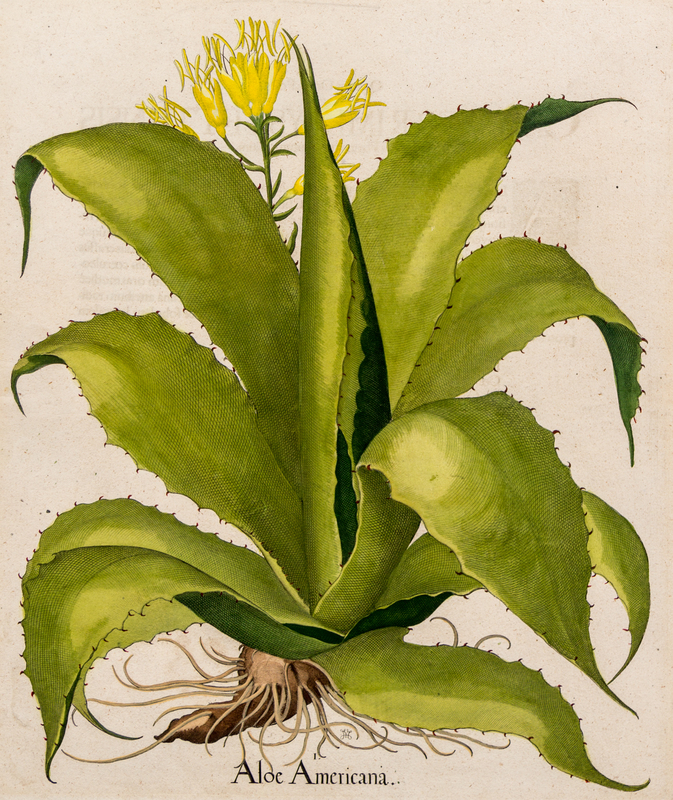 Aloe Americanafrom Hortus Eystettensis, Eichstatt and Nuremburg, 1613 or laterCopper plate engraving with later hand-coloring, image 19 x 16 in (20 3/4 x 17 1/2 in sheet), on laid paper with Latin text on verso, short tear to image repaired on verso, a few marginal pale stains, some light chipping to edges, matted.