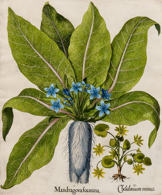 I. Mandragora foemina, II. Chelidonium minusfrom Hortus Eystettensis, Eichstatt and Nuremburg, 1613 or laterCopper plate engraving with later hand-coloring, image 18 5/8 x 15 1/2 in (20 7/8 x 16 1/4 in sheet), on laid paper with grape cluster watermark, no text on verso, some minor mostly marginal spotting or background staining, some light chipping to sheet edge, matted.