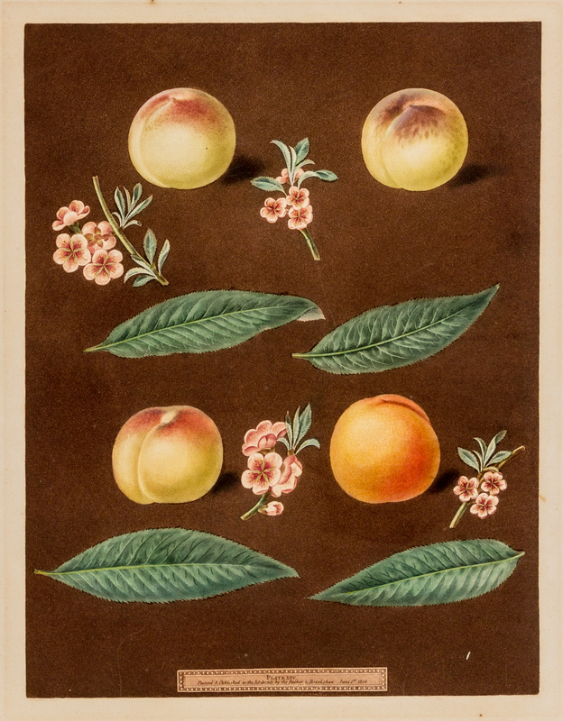 Four Peaches (Plate XXV)from Pomona Britannica, London, 1804-1812Engraving with hand-coloring, plate 18 5/8 x 14 1/2 in, sheet 21 5/8 x 17 1/25 in, on J Whatman dated 1804, light mat burn to margins, a few pale marginal spots, old tissue adhered to extreme upper margin, outer margin verso with glue stains and old backing remnants, matted.