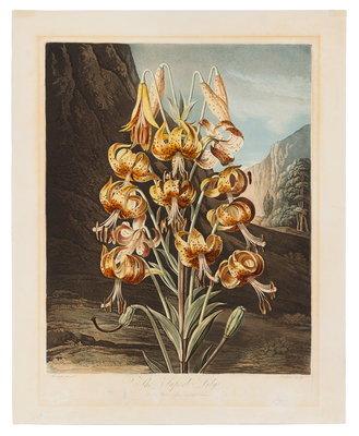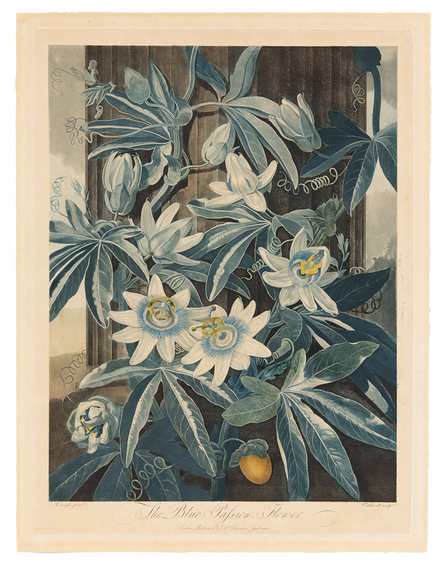 The Blue Passion Flower -- The Superb Lilyfrom The Temple of Flora; or Garden of Nature. Picturesque Botanical Plates of the New Illustration of the Sexual System of Linnaeus, London, 1799-1807 (watermarked 1794 and H Smith 1810, respectively)2 engravings with hand-coloring, plates 20 1/2 x 15 in, 19 x 14 1/4 in, sheets 21 5/8 x 16 1/2 in, 22 x 17 11/16 in. Some overall browning and mat burn, Superb Lily with spotting and small holes repaired lower margin, hinged to backing board upper margin verso.