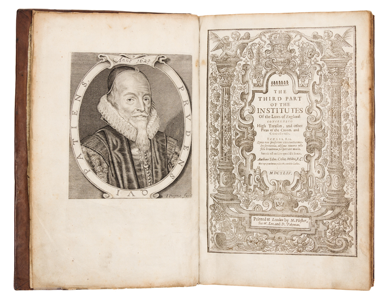 Folio (293 x 187 mm). Engraved portrait frontispiece signed "I. Payne," title printed within elaborately engraved border, final epilogue leaf, 14pp. table (not called for by ESTC) bound in at end. (Some staining, a penultimate leaf torn with slight loss to a few letters, last leaf of table and rear endpaper lacking about a third and defective.) Contemporary calf, spine in 7 compartments with 6 raised bands (some light wear). FIRST EDITION. "Coke's Third Institute give us a Treatise of great learning, and not unworthy of the hand that produced it" (Marvin). ESTC R12841; Marvin Legal Bibliography 208; PMM 126.