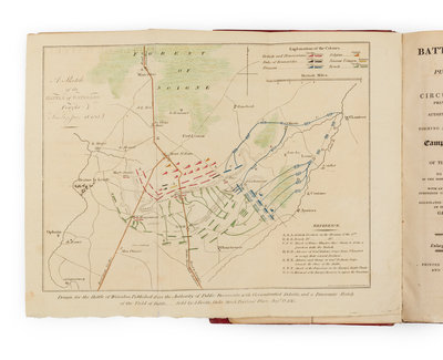 2 parts in one volume, 8vo (225 x 125 mm). 2 hand-colored engraved plans, 2 hand-colored engraved folding panoramas, half-leaf 139* inserted between pp.138 and 139. (A few tears to folds of panoramas, some pale spotting.) Contemporary half red morocco, spine gilt, top edge gilt, others uncut (joints discreetly reinforced, very slightly rubbed). Sixth edition, with fine plans of the Battle of Waterloo, and the Campaign in the Netherlands. Eaton was in Brussels at the time of the Battle of Waterloo, and by 1817, her work on the battle was in its 10th edition.