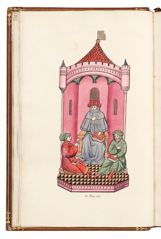 Large 4to (263 x 168 mm). Hand-colored engraved frontispiece, numerous in-text illustrations. (Scant spotting.) Contemporary tan russia, outer wide strapwork border gilt, inner blind volute border surrounding single fillet, fleuron tools in corners, spine in 5 compartments with 4 triple bands gilt-lettered within blind borders in 2, the rest with central saltire, fleurons, dots and roundels gilt, board edges gilt, turn-ins gilt, edges gilt BY HERING WITH HIS TICKET (skillfully rebacked preserving original spine, endpapers renewed, some very minor wear). FIRST EDITION, LIMITED EDITION, ONE OF 50 LARGE-PAPER COPIES. Longman purchased the library of English poetical historian Thomas Park (1759-1834) from Thomas Hill (1760-1840). "Longman's speculation was not a profitable one. A few of the more expensive books were bought by Sykes and Heber...the larger portion of the books...were subsequently brought together again in the Britwell Library" (De Ricci, pp.91-92).