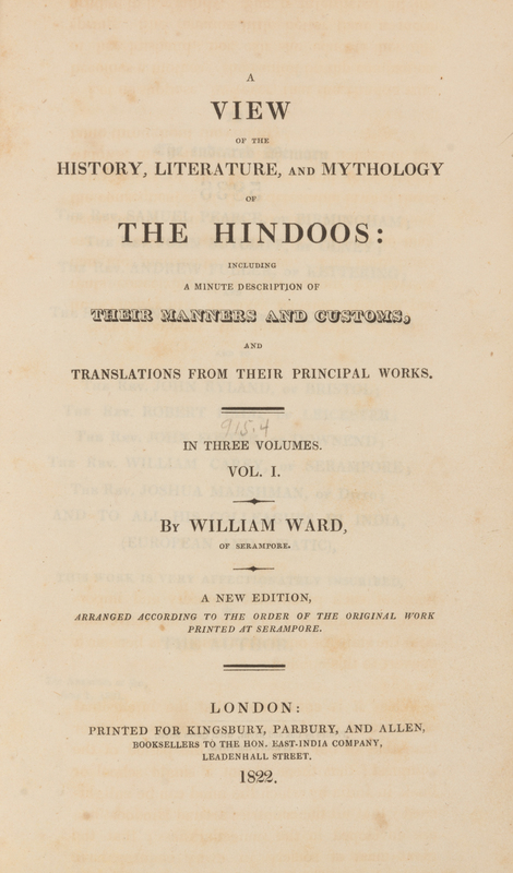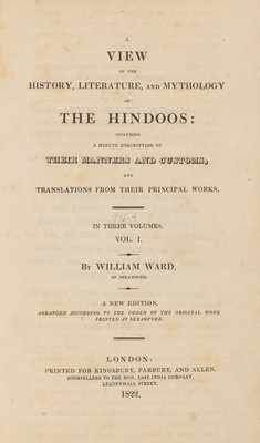 BAYLEY, Edward. History of India. London, 1886. -- EARL, George Windsor. The Eastern Seas. London, 1837. 8vo. Contemporary quarter calf. FIRST EDITION. -- MARSHALL, William. Travels Amongst the Todas or the Study of a Primitive Tribe in South India. London, 1873. -- PHILLIPS, J. Thomas (translator). An Account of the Religion, Manners and Learning of the People of Malabar in the East-Indies. London, 1717. 12mo. Contemporary calf. FIRST EDITION. -- WARD, William. View of the History, Literature and Mythology of the Hindoos. London, 1822. 3 volumes. -- Together, 5 works in 7 volumes, condition generally fine.