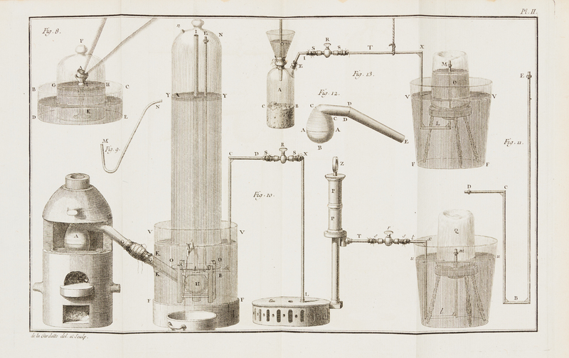 2 parts in one volume, 8vo (198 x 127 mm). 3 engraved folding plates after La Gardette. (Some creasing to plates.) Contemporary tan calf gilt, edges red (upper cover detached, chipping with losses to spine). FIRST EDITION in which Lavoisier refutes phlogiston theory, and including a review of his experiments with gasses, and in combustion and calcination. Lavoisier, known as the father of modern Chemistry, did not publish any additional volumes of this work.