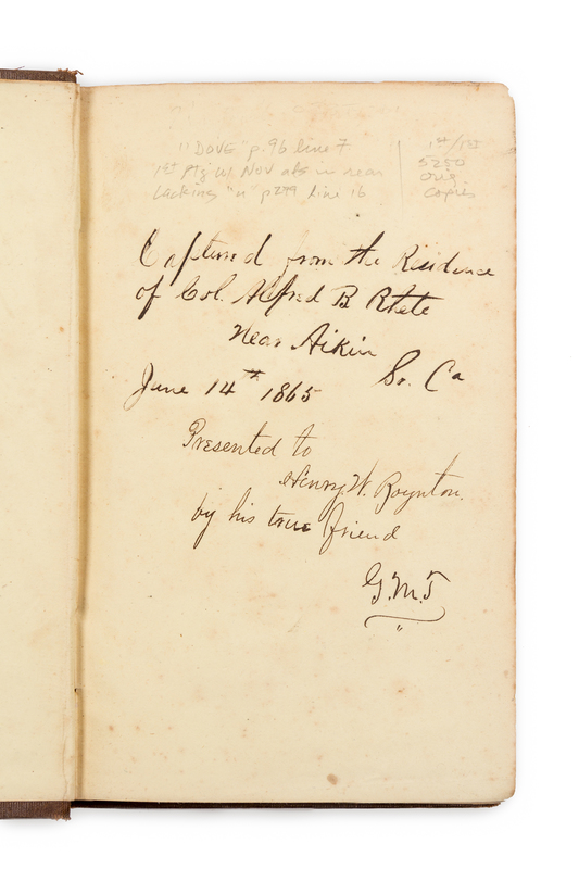 8vo (179 x 115 mm). 12-page publisher's advertisements dated November 1855. (Some light browning, a few pale spots, as usual.) Original brown cloth, sides blind-stamped, gilt-lettered on spine (some light wear, particularly to spine ends, a few minor stains or rubbing, spine leaned). FIRST AMERICAN EDITION, FIRST PRINTING, from the collection of Henry W. Boynton, known for his edited editions of works by Bret Harte, James Fenimore Cooper, John Milton, Alexander Pope, Tennyson, and Washington Irving. BAL 12112.