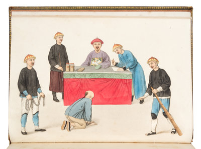 Folio (353 x 257 mm). Title-pages and text printed in English and French, 22 hand-colored engraved plates captioned in English and French, sheets watermarked 1817. (Some pale spotting or offsetting.) Contemporary green straight grained morocco, sides decorated in gilt and blind, spine gilt, edges gilt (rebacked preserving original spine, some overall wear, portion of morocco lacking lower cover). Later edition of this work, attributed to artist George Henry Mason, which describes in graphic detail forms of punishment for crimes committed in China. Each plate illustrates one type of punishment from less severe penalties like "Torturing the Fingers" and "Twisting a Man's Ears," to the most serious "The Manner of Beheading." The accompanying text, in both French and English, further explains the method by which the punishment is delivered. See Abbey Travel 532.