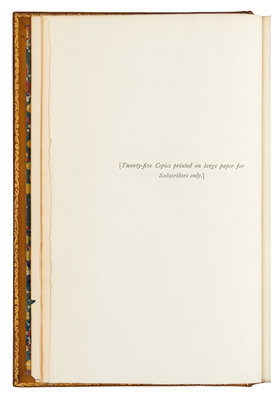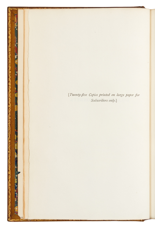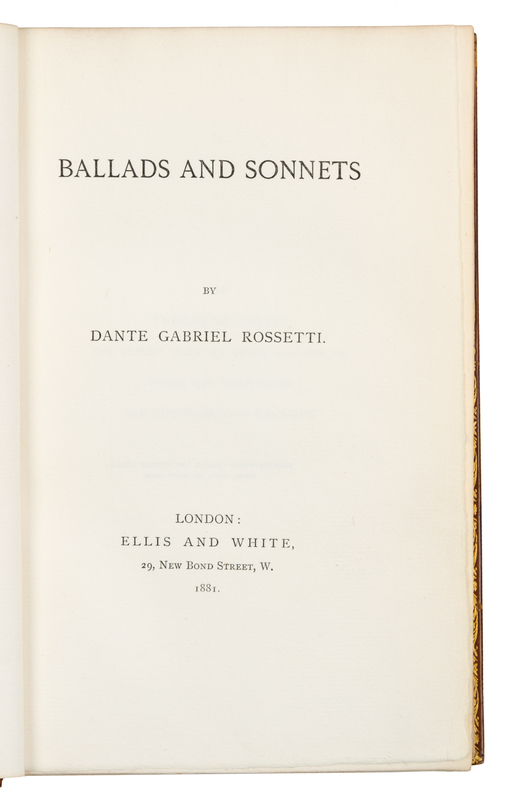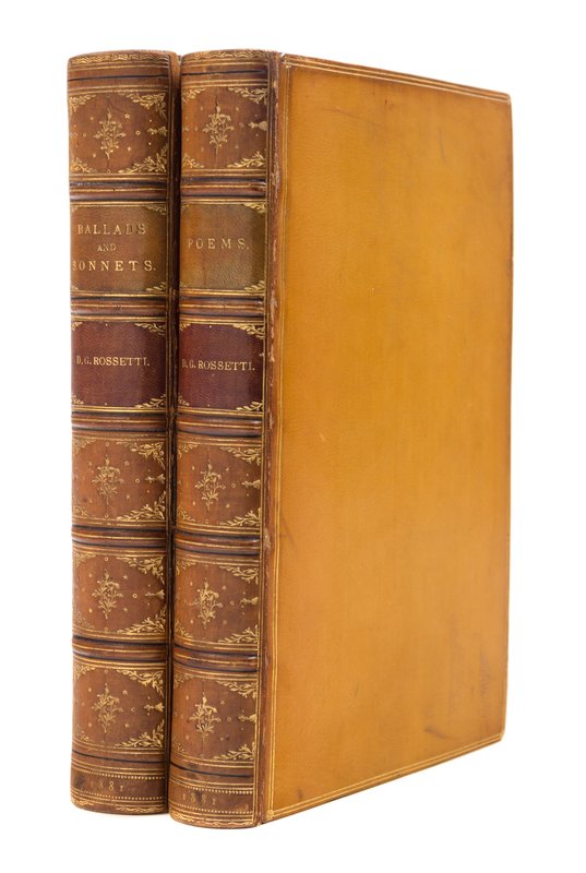 Ballads and Sonnets. London: Ellis and White, 1881. 8vo (220 x 142 mm). Half-title. Tan calf gilt, citron and brown morocco lettering pieces gilt, spine gilt, top edge gilt, others uncut. FIRST EDITION, FIRST ISSUE, ONE OF 25 LARGE PAPER COPIES so stated on verso of half-title. This third collection of poems completes "The House of Life" sequence of sonnets first introduced in his Poems of 1870. [Uniformly bound with:] Poems. London: Ellis and White, 1881. 8vo (220 x 142 mm). Half-title. New edition, first issue, ONE OF 25 LARGE PAPER COPIES. The 1881 edition of Rossetti's Poems includes four poems not included in the 1870 edition. Both works printed on fine handmade paper. Large paper copies of Rossetti's works are rare on the market at auction.