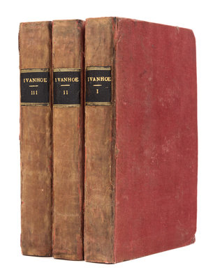3 volumes, 8vo (198 x 120 mm). Half-titles, Author's Advertisement leaf in first volume, 3 pages of advertisements at end of third volume. Original rose silk-covered boards, edges uncut, later morocco lettering-pieces gilt (rebacked preserving original spines, some overall wear or staining). FIRST EDITION OF ONE OF THE MOST POPULAR HISTORICAL NOVELS. This copy with points of the first state in vol.I as identified by Worthington with one exception: pagination ends on p.298, forme-mark on p.[iii] is 9; "Peter" reading on p.iv line 6; p.v, line 12 the second and fourth words are "which, not the third as noted in Worthington, but with the 6 forme-mark; observed" is the first word on p.vi, line14; without commas on p.ix, line 1 after "fought or p.xii, line 5 after "people"; "toilsome" reading on p.xv, line3; no forme-marks on pp.xvi, xix, or xxiv, forme-marks "9" on p.xxviii and "12" on pp.xxx; a comma after "paste" on p.xxix. The space between the horizontal rules on the half-titles to vols.II and III differ slightly in measurement from Worthington (31mm instead of 34 mm, and 34 mm instead of 31, respectively), as does the length of the horizontal rule on p.3 in vol.III (14 mm instead of 15); vol.II p.71 with the forme-mark "5" as per Todd (but not called for in Worthington). Scott wrote Ivanhoe between July and November of 1819. The first printing of 12,000 copies was released in December 1819, and completely sold out in two weeks. Todd 140Aa; Worthington 8.
