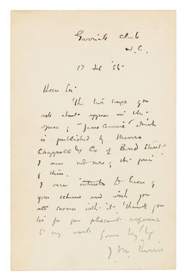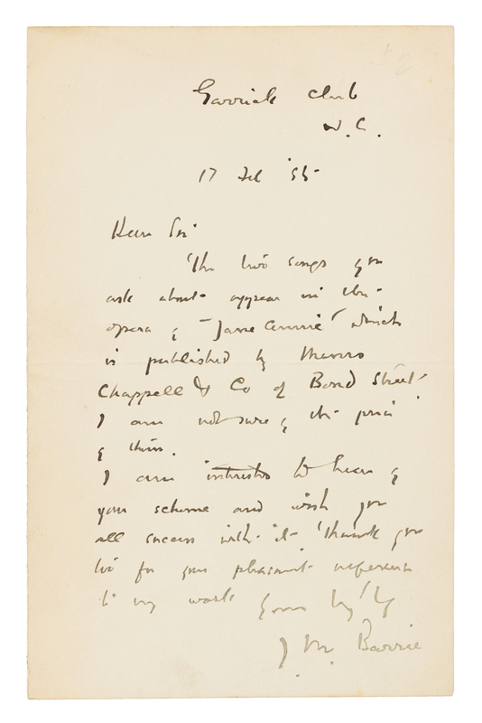 1 page, 12mo, slight browning to margins. "The two songs you ask about appear in the opera 'Jane Annie' which is published by Msssrs. Chappel & Co. of Bond Street." Barrie and Arthur Conan Doyle wrote the lyrics to the comic opera Jane Annie, with music by Ernest Ford.