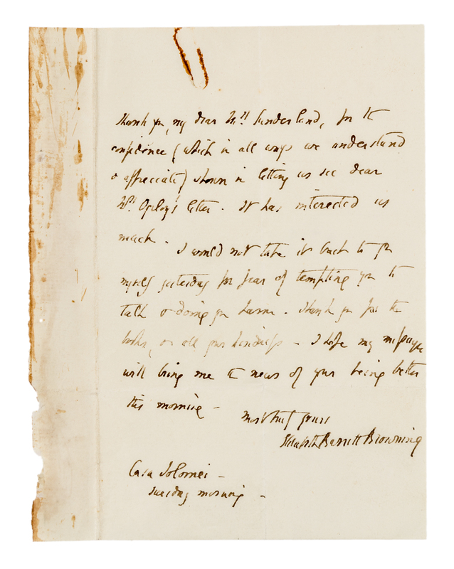 BROWNING, Elizabeth Barrett (1806-1861). Autograph letter signed ("Elizabeth Barrett Browning"), to Mrs. Sunderland. Casa Solomei [Italy], [n.d.] ("Sunday Morning").