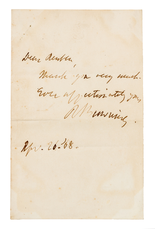 1 page, 8vo, blind embossed seal upper margin, creasing, staple holes upper left, a few pale stains. To Reuben Browning. In full: "Thank you very much. Ever affectionately yours R Browning." Written in the year Browning began The Ring and the Book, which would become his most successful. Reuben Browning was Robert's much-loved uncle. Browning's Correspondence 68034-10.