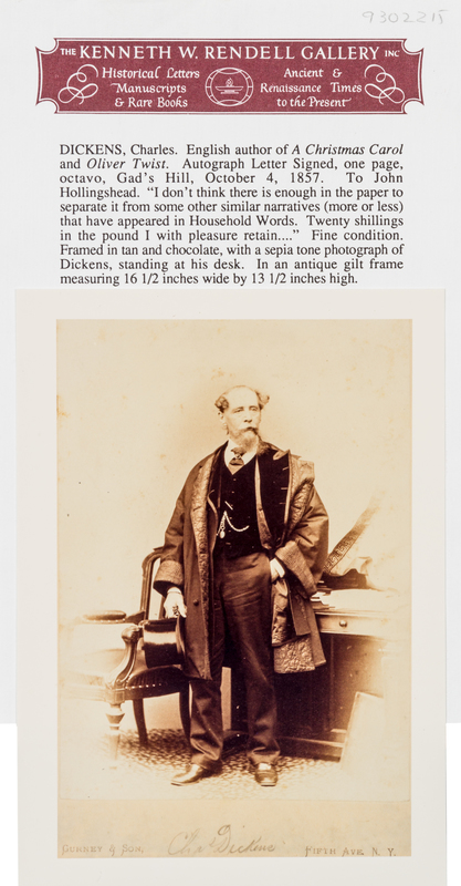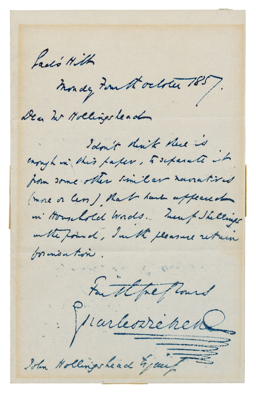 1 page, 8vo, pale mat stain at edges, some minor ink transfer. Regarding his submission for Household Words, Dickens writes: "I don't think there is enough in this paper to separate it from some other similar narratives (more or less) that have appeared in Household Words. Twenty shillings in the pound I with pleasure return for insertion"The journalist John Hollingshead (1827-1904) continued to submit pieces to Dickens and would eventually become a major contributor to Household Words, and later turned theatrical manager in 1865. "In 1857 he sent to 'Household Words,' then edited by Charles Dickens, a sketch of city life, called 'Poor Tom, a City Weed.' The article pleased the editor, whose sentiment and style Hollingshead emulated, and he joined the staff. He was a voluminous contributor of graphic articles, chiefly descriptive of current incident and of out-of-the-way scenes of London life" (DNB).