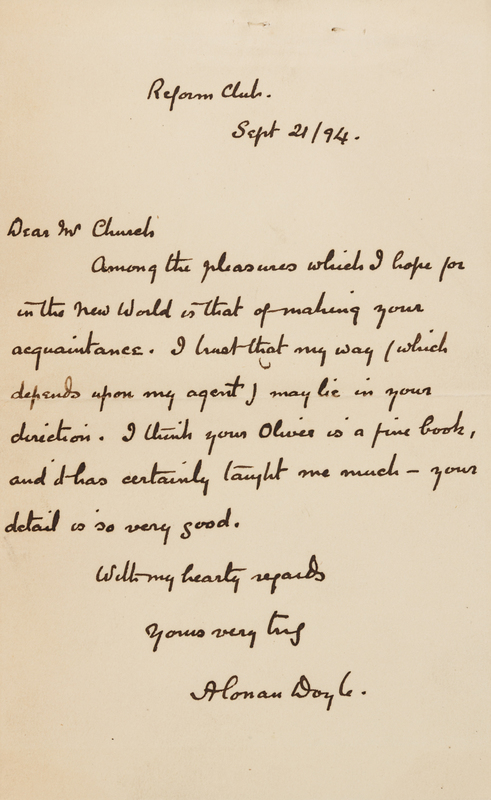 DOYLE, Arthur Conan (1859-1930). Autograph letter signed ("A Conan"), to Mr. Church. Reform Club, 21 September 1894.