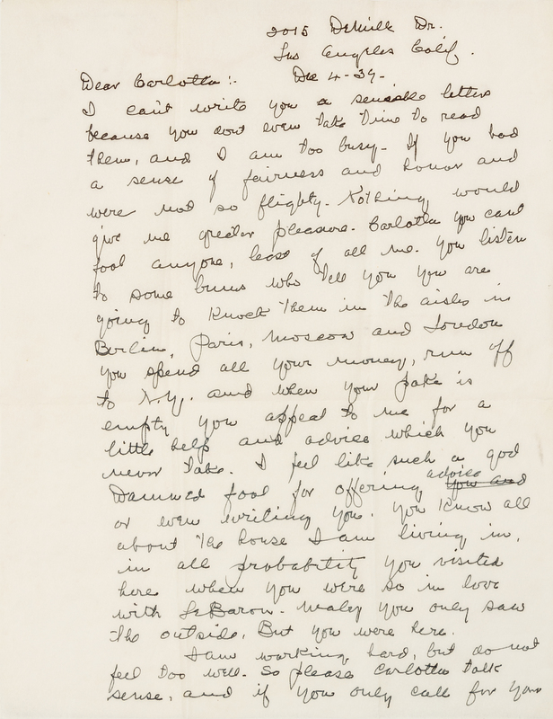 FIELDS, William C. (1880-1946). Autograph letter signed ("Grumpy Old Fields"), to his estranged mistress, Carlotta Douglas. Los Angeles, 4 December 1939.