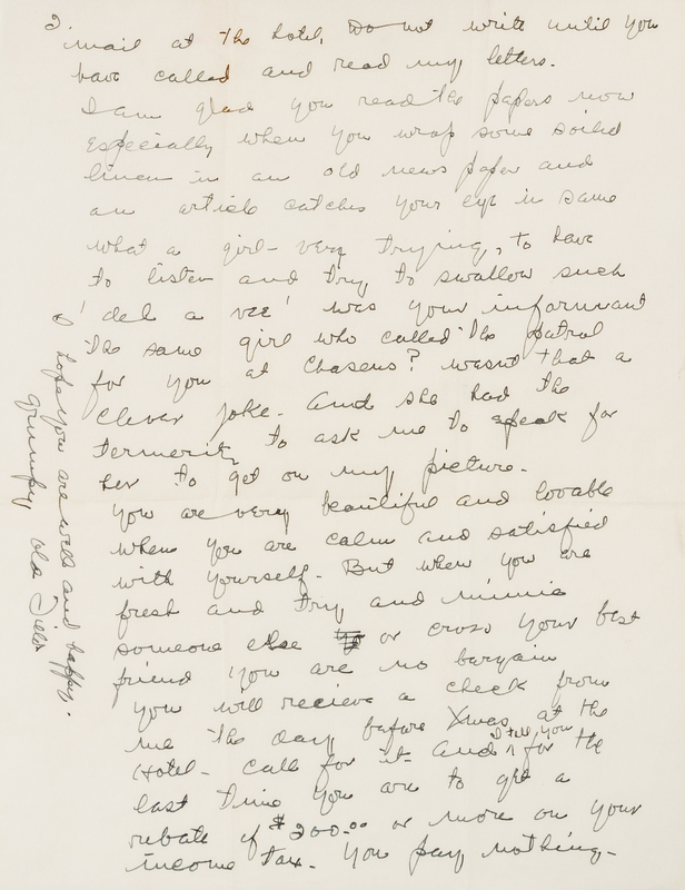 2 pages, 4to, on recto and verso, creased at folds, with original holograph envelope. A bitter Fields writes his estranged mistress: "I can't write you sensible letters because you don't even take time to read them you can't fool anyone, leas of all me. You listen to some bums who tell you you are going to knock them in the aisles in Berlin, Paris, Moscow you spend all your money, run off to N.Y. and when your poke is empty, you appeal to me for a little help and advise which you never take. I feel like such a God dated fool for offering advice or even writing you"
