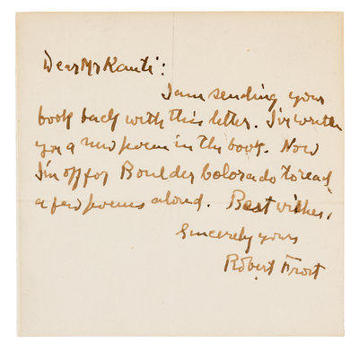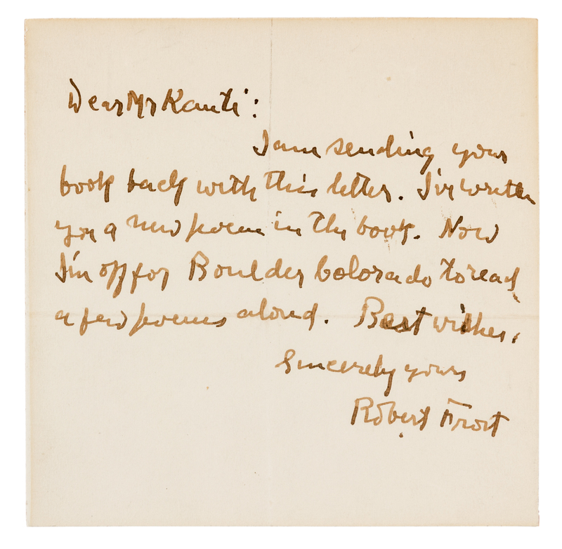1 page, 12mo (145 x 145 mm), some creasing, mounted to heavy cardstock. Frost writes a note to enclose with a book which he signed and inscribed with a poem for the recipient (not present). "I am sending your book back with this letter. I've written you a new poem in the book. Now I'm off for Boulder Colorado to read a few poems aloud. Best wishes. Sincerely yours."
