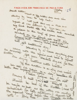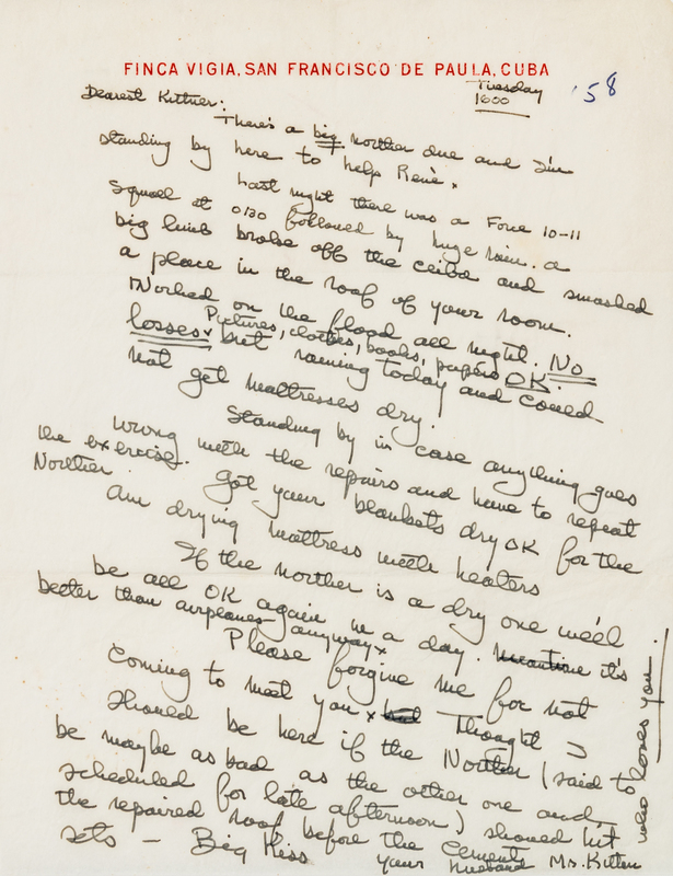 1 page, 4to, on Finca Vigia stationery, creased at folds. Discussing damage from ongoing storms, and reporting "There's a big norther due and I'm standing by here to help Rene. Last night there was a Force 10-11 squall at 0130 followed by a huge rain. A big limb broke off the ceiba and smashed a place in the roof of your room. Worked on the flood all night. No losses, Pictures, clothes, books, papers OK". With postscript note up right margin "who loves you".