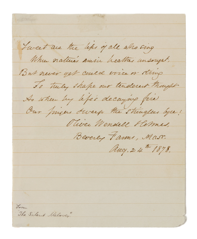 1 page, 8vo, on lined paper, slight ink smudge, very minor chipping lower corner, a few small stains or mounting remnants verso. Holmes quotes from his poem "The Silent Melody."
