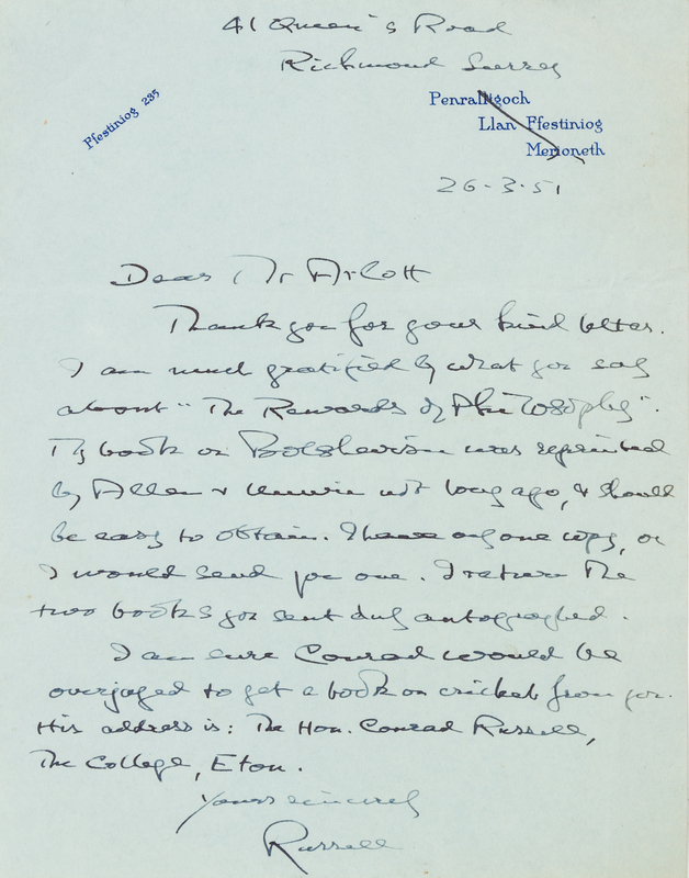 RUSSELL, Bertrand (1872-1970). Autograph letter signed ("Russell"), to Mr. Arcott. Richmond Surrey, 26 March 1951.
