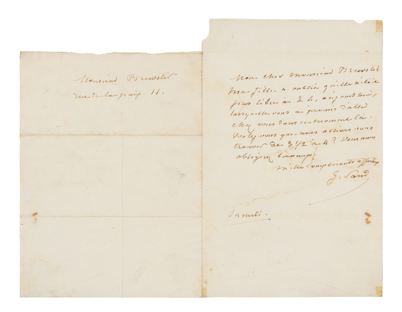 1 page, 8vo, bifolium, faint dampstain touching writing, a few other small stains, mounting remnants to three corners, one inch segment excised from top margin of blank leaf. Sand tells the recipient that her daughter will not be free at until later that afternoon, and asks to change their meeting time.