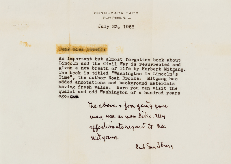 SANDBURG, Carl (1878-1967). Typed manuscript with autograph note signed ("Carl Sandburg"), to Miss Newell, Flat Rock, 23 July 1958.