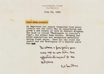 1 page, oblong 8vo, on Connemara Farm stationery, tape residue to typed salutation, staple holes upper left corner. Discussing Herbert Mitgang's recent book about Lincoln, and closing (in his hand): "The above & foregoing you may use as you like. My affectionate regard to Mr. Mitgang."