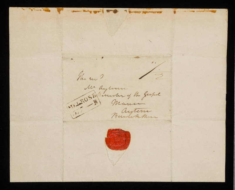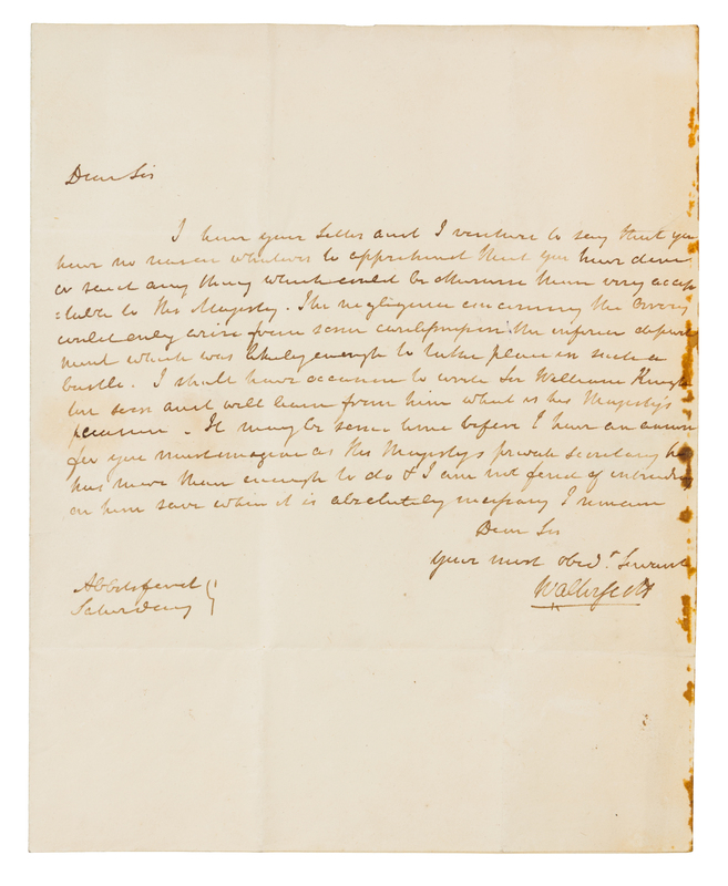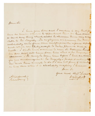 1 page, 4to, integral address leaf addressed by Scott, address leaf lightly soiled, small diagonal area torn away where wax seal was opened, seal attached at lower margin, staining extremem right margin, creased. Scott promises to reach out to his Majesty's private Secretary to inquire on the recipient's behalf. "I have your letter and I venture to say that you have no reason whatever to apprehend that you have done or said any thing which could be otherwise deemed(?) very acceptable to his Majesty."