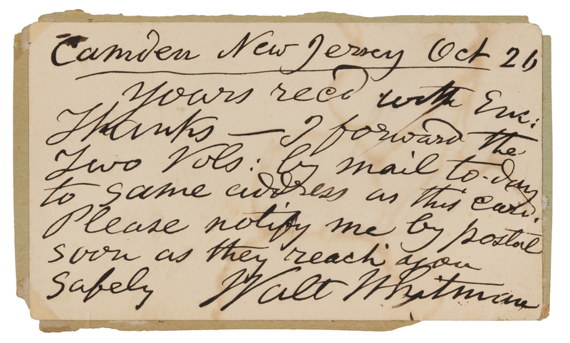 1 page, oblong 12mo (82 x 137 mm), with holograph address on verso, mounting remnants along edges, some staining and minor creasing, small scotch tape remnants left corners. Complying with a request ordering the 2- volume 1876 Centennial Edition of Leaves of Grass: "Yours recd with Enc. Thanks- I forward the two vols. by mail to-day to the same address as this card. Please notify me by postal soon as they reach you" A fragment of Forbes's letter to Whitman enclosing $10 for the 2 vol. Centennial Edition ("would you put your autograph on the fly leaf of each volume") is in the Charles E. Feinberg Collection of the Papers of Walt Whitman, Library of Congress. Whitman apparently cut Forbes's letter into pieces which were then pasted together with pieces from other letters upon which he wrote part of a prose draft titled "Poetry in America-Shakspere-the Future." The surrounding fragments are dated 1880.