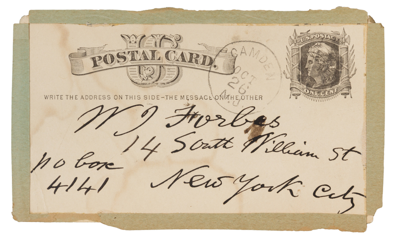 WHITMAN, Walt (1819-1892). Autograph note on postcard signed ("Walt Whitman"), to W. J. Forbes. Camden, New Jersey, 26 October [c.1880].