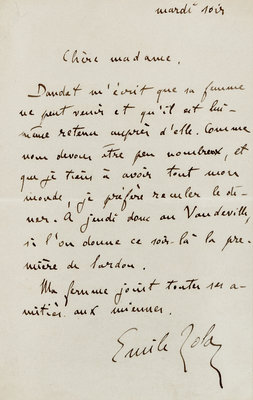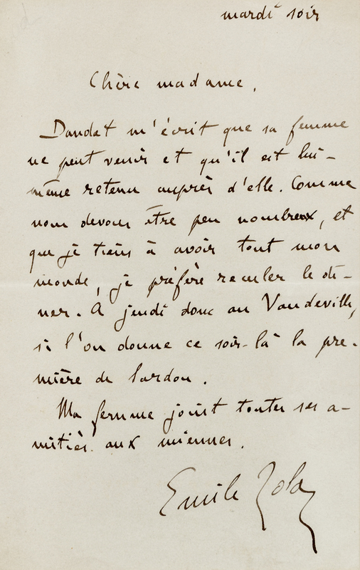 1 page with integral blank leaf, 12mo, slight crease from paperclip upper left. Zola writes that Alphonse Daudet's wife will not be able to attend a dinner, and that he must cancel. Zola asks the recipient if she can postpone until Thursday at the Vaudville.