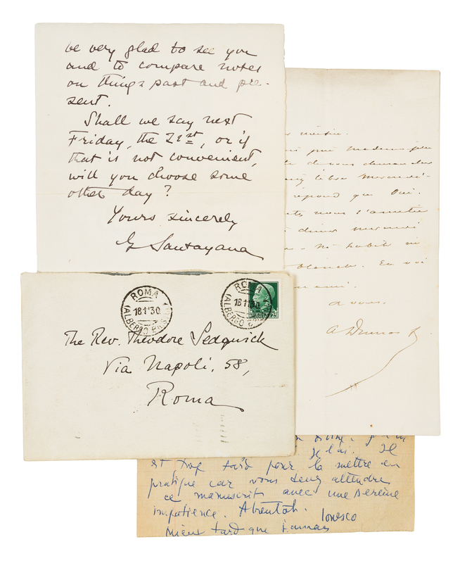 DUMAS, Alexandre, fils (1824-1895). Autograph letter signed ("A Dumas fils"), in French, to an unnamed recipient, n.p., n.d. 1 page, 8vo, a few minor marginal stains. Dumas arranges a meeting between the recipient and Miss Delaports. -- IONESCO, Eugene (1909-1994). Autograph letter signed ("Ionesco"), to an unidentified recipient [but probably Maurice Roche], n.p., n.d. 1 page, 8vo, on a grid-lined sheet, pencil address presumably in the author's hand in wide upper margin. Ionesco apologies that the recipient had to wait for a speech, but promises it is coming soon, as he has just found his inspiration. -- SANTAYANA, George (1863-1952). Autograph letter signed ("G. Santayana"), to Reverend Theodore Sedgwick, Rome, Italy, 18 November 1930. 2 pages, 8vo, with original hand-addressed envelope. Santayana makes plans for a lunch date with the recipient. -- Together, 3 manuscripts.