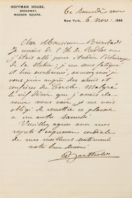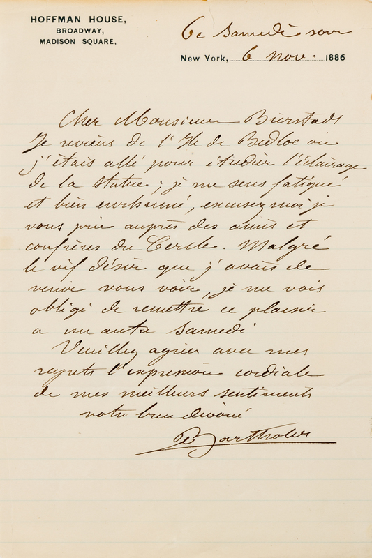 1 page, 8vo, creased at folds, on Hoffman House, New York stationery. Following a visit to the Statue of Liberty, Bartholdi apologizes to the American artist Albert Bierstadt for missing an engagement. "Dear Mr. Bierstadt, I am returning from Bedloe Island where I had gone to study the lighting of the statue [of Liberty]. I feel tired and very exhausted, please excuse me to our friends and colleagues of the Circle. In spite of the strong desire I have to come and see you, I am obliged to put this pleasure off until another Saturday. Your very devoted Bartholdi."