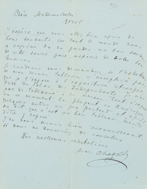 1 page, 4to, on blue stationery, creased at folds, a few pale spots. Chagall requests the French dealer Weill to enquire if the purchaser of his most recent picture would allow it to be included in the retrospective exhibition at the Salon des Independants. "I have no pictures at the house-everything is on show at the moment, most of it in America, and a few others hare and there, and since people say it is a good picture, it deserves to be shown"