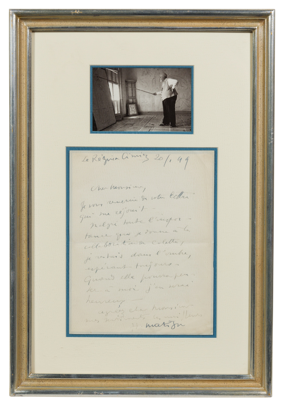 1 page, 4to, creased to folds; matted and framed with a portrait of Matisse in his studio. Thanking the recipient for a letter and discussing a collaboration with Colette. "Although Colette's collaboration is very important to me, I was remaining in obscurity, full of hope. When she has a chance to think of me, that will make me happy" The collaboration he is discussing may be for Colette's La Vagabonde, published in 1951, which included a lithograph portrait frontispiece by Matisse.