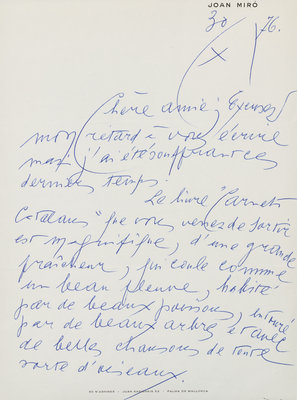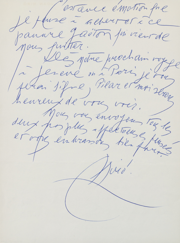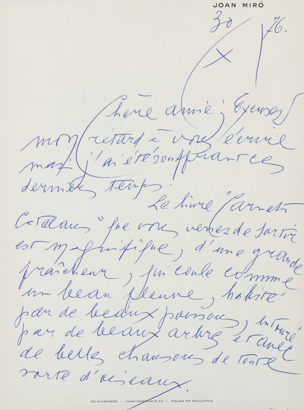 2 pages, 4to, on personal stationery, with original holograph addressed envelope, creased at folds. In advance of publication Miro effusively responds to his book Carnets catalans, published by Skira: "The book Carnets catalans [Catalan Notebooks] is great inhabited by beautiful passion, surrounded by beautiful and full of beautiful songs It's with great emotion the I think about and poor Gaeton" Gaeton Picon edited and provided the introduction for the book, which was published in 1977.