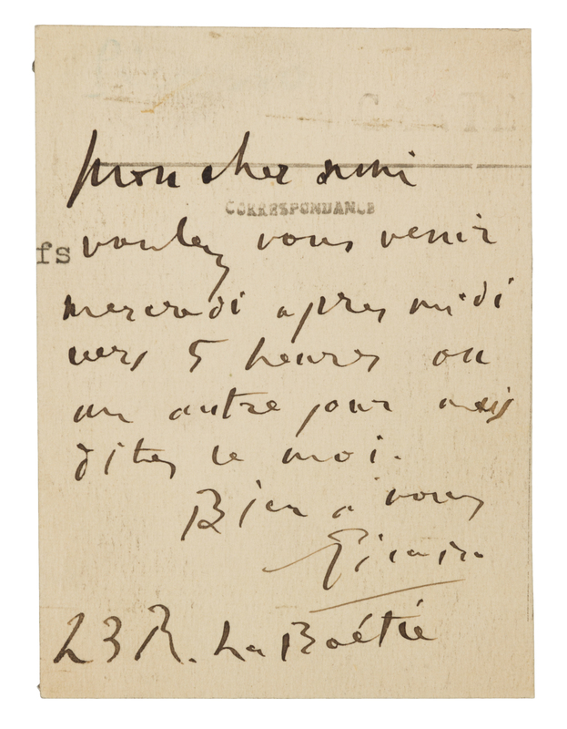 1 page, 12mo (90 x 67 mm), clipped from a larger card with stampped "Correspondance" and line upper margin and typed "fs" left margin. Inviting a friend to seem him at his studio. Written from his long-standing Paris address at 23 rue de La Botie, close to his dealer Paul Rosenberg's gallery, where the artist lived form 1919 until 1941.